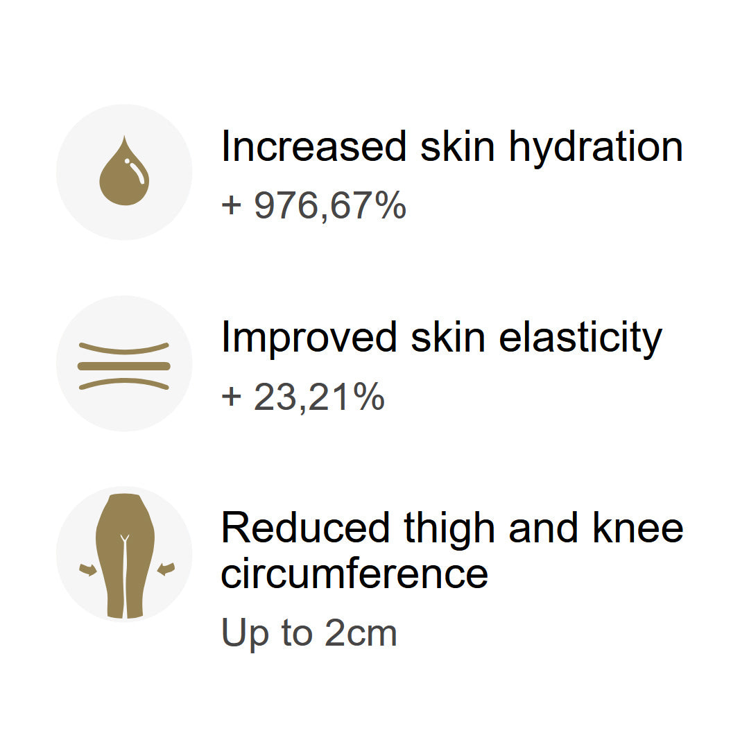 Yaluronica® 24K gold nanoparticles, entirely infused with hyaluronic acid molecules on the fabric, constantly conveys hyaluronic acid leaving skin feeling softer, more hydrated and elastic while reducing thigh circumference. Results are visible after 8 hours and optimal in just 4 to 8 weeks.